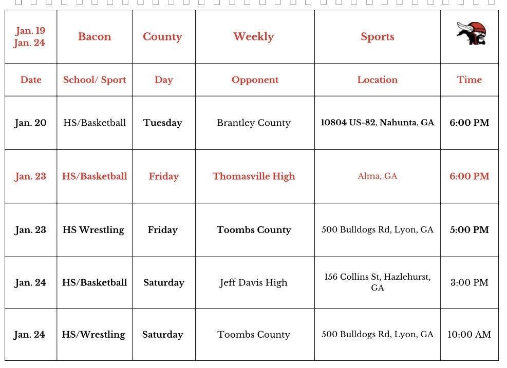 BCSD Weekly Athletics Schedule