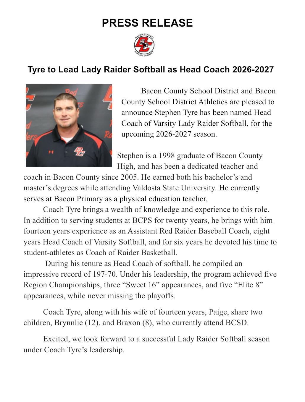 Tyre Named Head Coach of Varsity Lady Raiders Softball for 2026-2027